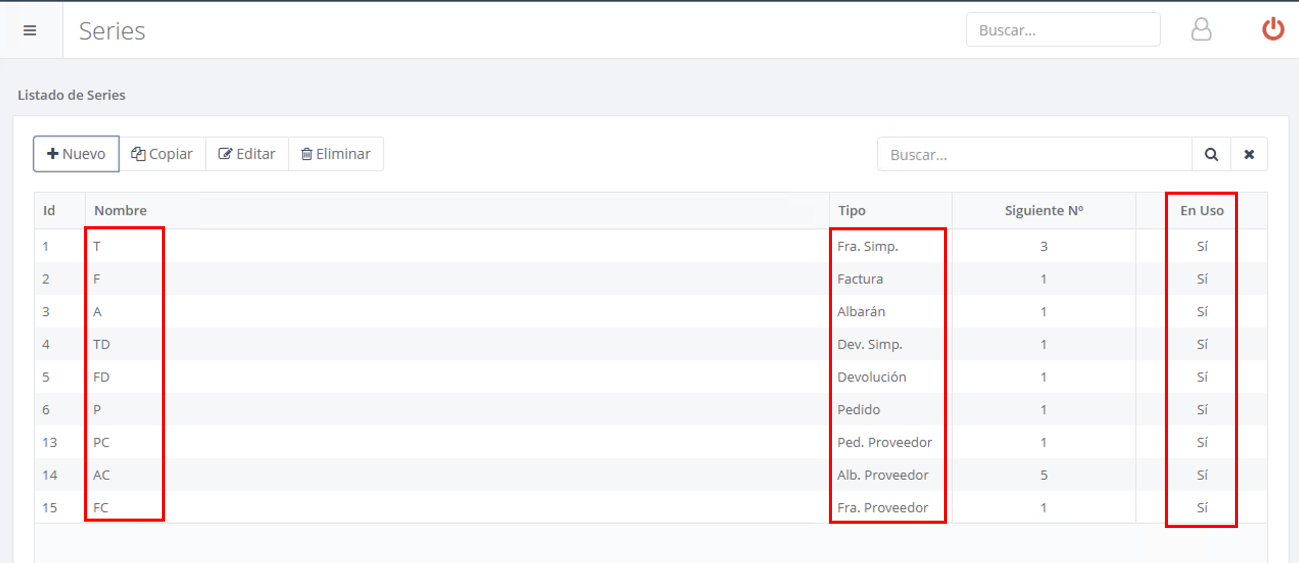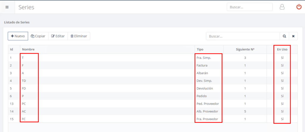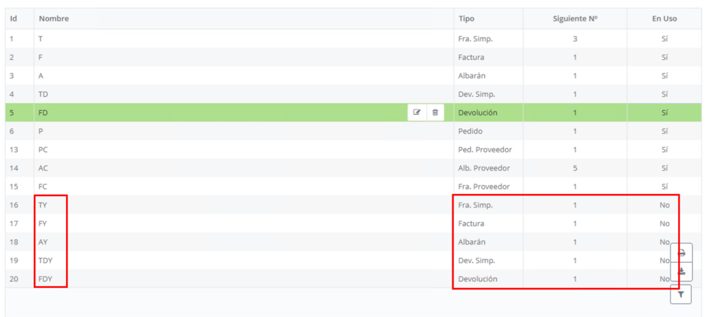 En el listado de series aparecerán estas nuevas referencias con su tipo y el siguiente número disponible. Hasta que no se asignen en la configuración global, figurarán como “En uso: No”.